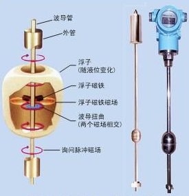 傳感器工作時,電路部分將在波導(dǎo)絲上激勵出脈沖電流,該電流沿波導(dǎo)絲傳播時會在波導(dǎo)絲的周圍產(chǎn)生脈沖電磁場。在傳感器測桿外配有一浮子,此浮子可沿測桿隨液位的變化而上下移動。在浮子內(nèi)部有一組永久磁環(huán)。當(dāng)脈沖電流磁場與浮子產(chǎn)生的磁環(huán)磁場相遇時,浮子周圍的磁場發(fā)生改變從而使得由磁致伸縮材料做成的波導(dǎo)絲在浮子所在的位置產(chǎn)生一個扭轉(zhuǎn)波脈沖,這個脈沖以固定的速度沿波導(dǎo)絲傳回并由檢出機構(gòu)檢出。   通過測量脈沖電流與扭轉(zhuǎn)波的時間差可以精確地確定浮子所在的位置,即液面的位置。