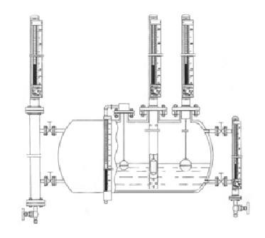 磁翻柱液位計測量液體時采用頂裝或旁通管側裝方式。磁翻柱主體外加裝翻柱液位指示器、液位開關及液位變送器。磁單元置于浮球內部或通過頂桿與浮球相連,當浮球連帶磁單元隨液位變化時,使磁性色塊(磁翻板)翻轉;磁性液位開關在對應液位點動作;同時液位傳感器在浮球磁力的作用下,輸出標準的變化電阻信號,再經過變送器把電阻信號轉換成4~20mA電流信號輸出。