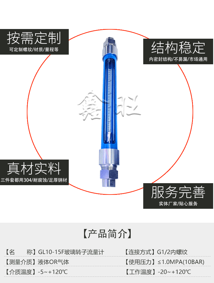 GL/RL/FL10、20、30型玻璃轉子流量計可替代引進成套設備上的玻轉儀表,廣泛的應用于化工、輕工、制藥、食品、造紙、環保和計量測量、科研等部門,測量單項非脈動流體(氣體或液體)的流量。