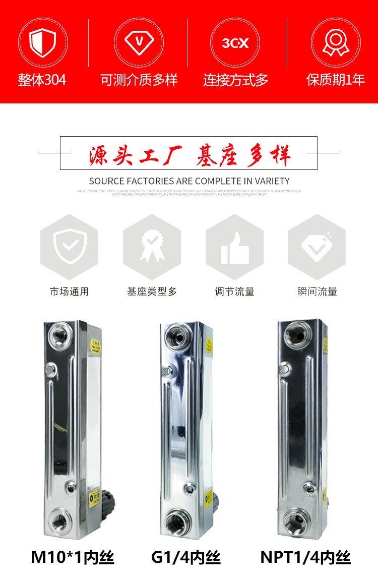 該系列流量設計適用微小流量的測試和調節,其特點外觀輕巧簡潔,安裝簡單方便,不必從管道上拆下整機,即可方便更換錐管和浮子,連接方式采用軟管或金屬管連接。