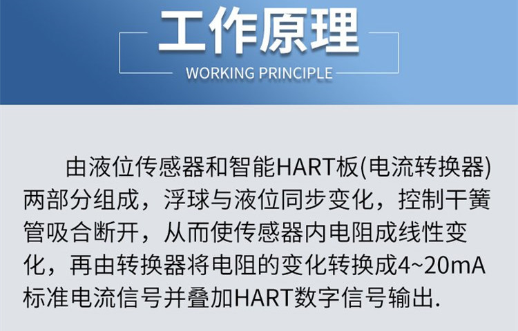 UQK磁性浮球液位計主要由磁浮球、傳感器、變送器三部分組成。浮球液位計采用304不銹鋼、pvc、PTFE等材料作保護管和安裝固定件;對于腐蝕性很強的介質,采用聚四氟乙烯燒結在接觸介質金屬保護管,浮球的表面,以確保液位儀表不被腐蝕。根據用戶要求預設磁敏元件,浮球隨液面上下運動改變磁敏元件的預設狀態發出通斷信號,實現對液面的監控。當磁浮球隨液面的變化,沿導管而上下浮動時,浮球內的磁鋼吸合傳感器內相應位置上的干簧管使傳感器的總電阻值發生變化,再由變送器將變化后的電阻信號轉換成4-20mA的電信號輸出,并通過數顯控制儀或光柱數顯儀對液位進行遠距離測量,并可在顯示儀上設定上、下限報警,實現對液位的遠程數字控制。