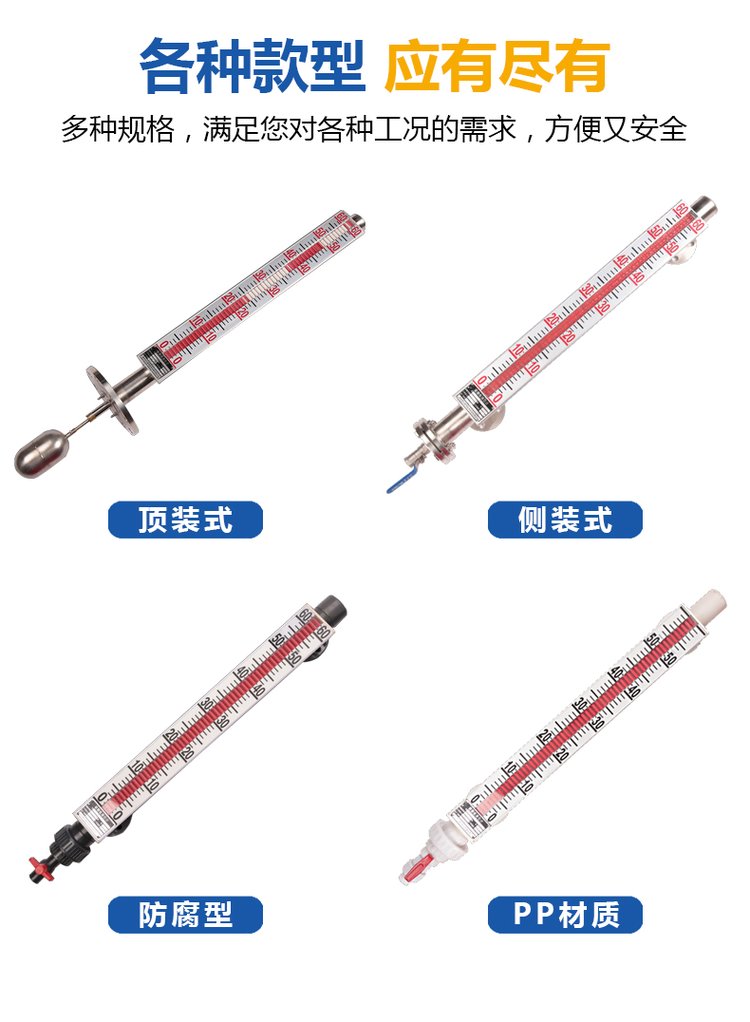 XW -UHZ側(cè)裝式/頂裝式防腐磁翻板液位計(jì)(PTFE:聚四氟乙烯)適用于地下儲(chǔ)罐、槽或池且介質(zhì)具有腐蝕性的液位的測(cè)量,根據(jù)不同介質(zhì)、溫度、壓力等條件不同分為以下幾種形式供客戶選擇。用戶可根據(jù)工程需要,配合遠(yuǎn)傳變送器使用,可實(shí)現(xiàn)就地?cái)?shù)字顯示,以及輸出4~20mA的標(biāo)準(zhǔn)遠(yuǎn)傳電信號(hào),可根據(jù)各種系統(tǒng)配套,也可配套磁致伸縮液位變送器使用,以配合記錄儀表,或工業(yè)過(guò)程控制的需要。也可以配合磁性控制開(kāi)關(guān)或接近開(kāi)關(guān)等使用,對(duì)液位監(jiān)控報(bào)警或?qū)M(jìn)液出液設(shè)備進(jìn)行控制。